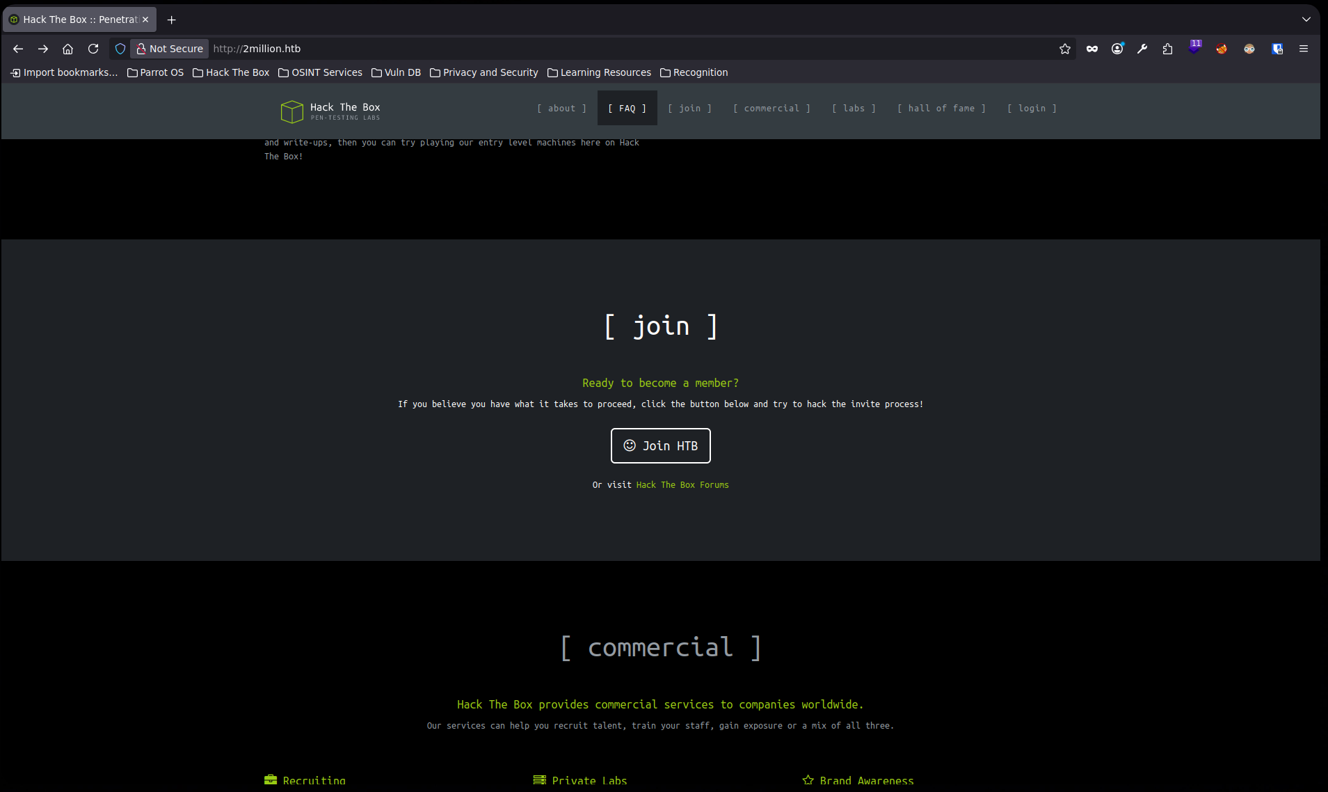 Al ingresar a la página desplegada por el puerto 80, se puede ver una antigua landing page de HackTheBox, por lo que para ingresar a la plataforma es necesario conseguir un código de invitación.