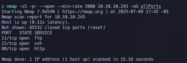 Identificación de puertos abiertos con Nmap Primero se realiza un escaneo básico para identificar los puertos abiertos de la máquina: