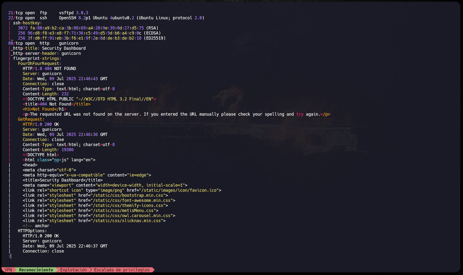 Luego se hace un escaneo más detallado de los puertos abiertos para encontrar posibles vulnerabilidades exportándose al archivo "targeted" en formato Nmap para que pueda leerse de forma más cómoda.1
