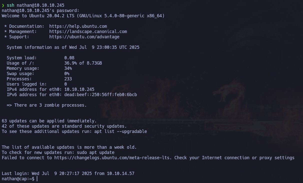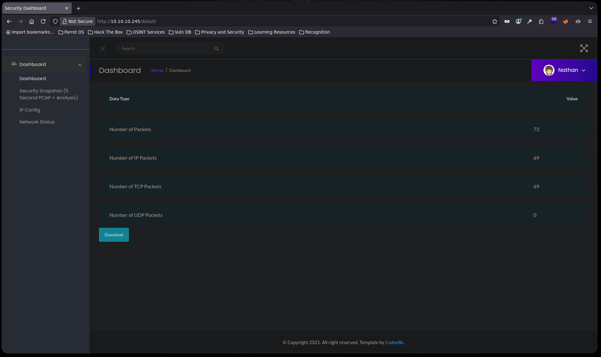 Revisión de la página web desplegada por el puerto 80 de la máquina Cap En este caso hay un dashboard, pero al revisarse no se encuentra nada que llame la atención excepto el apartado "Security Snapshot (5 Second PCAP + Analysis)"