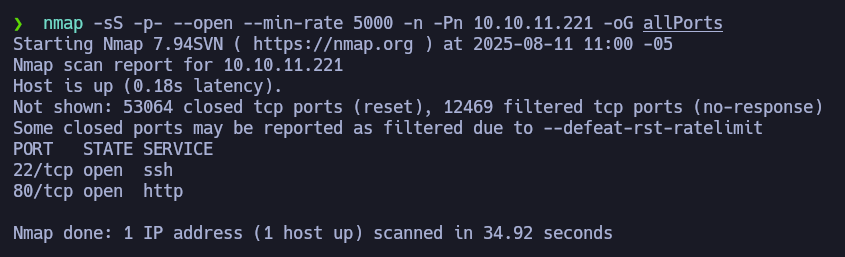 - Primero se realiza un escaneo básico para identificar los puertos abiertos de la máquina:
