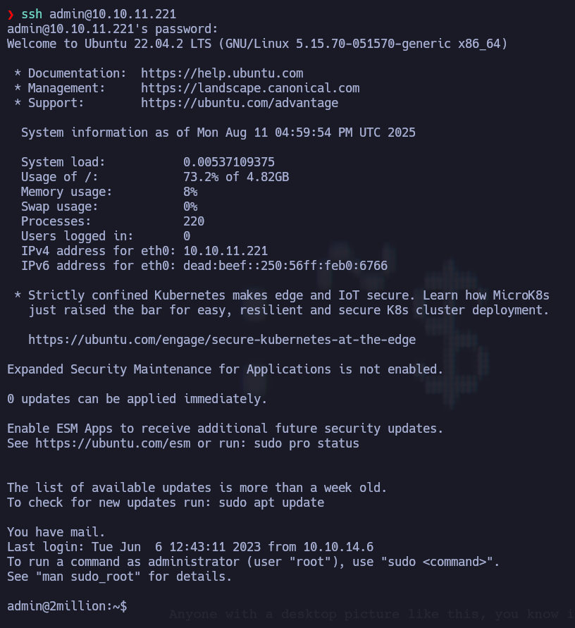Con las credenciales obtenidas (admin/SuperDuperPass123), se intenta acceder al usuario "admin" por medio de ssh: